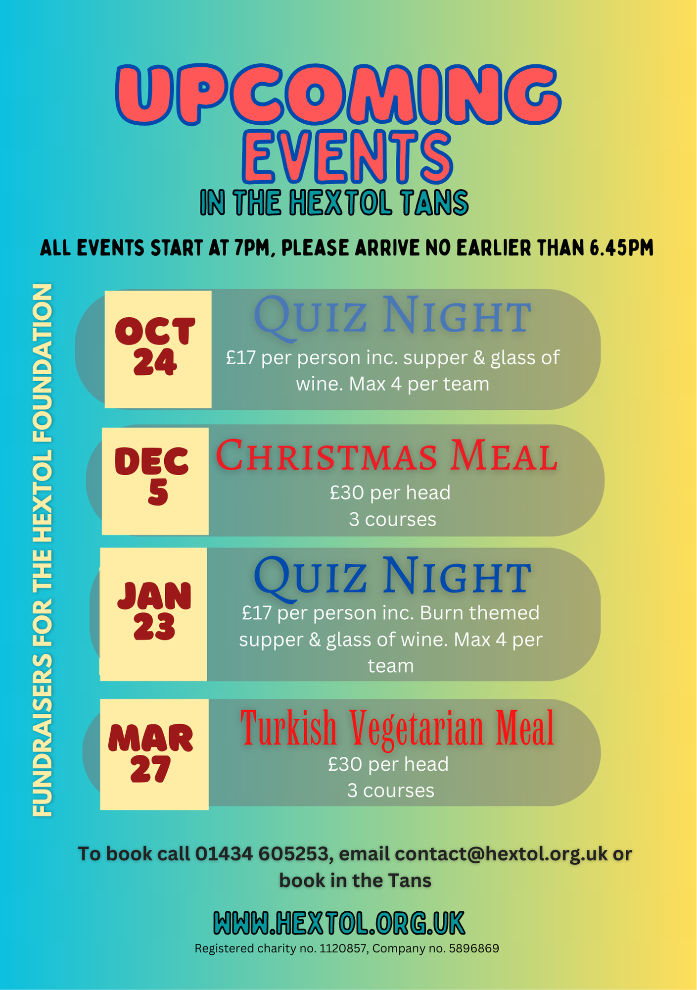 As we're part of The Hextol Foundation - a registered charity - we sometimes hold fundraising evenings. Please click here for details of our latest events.